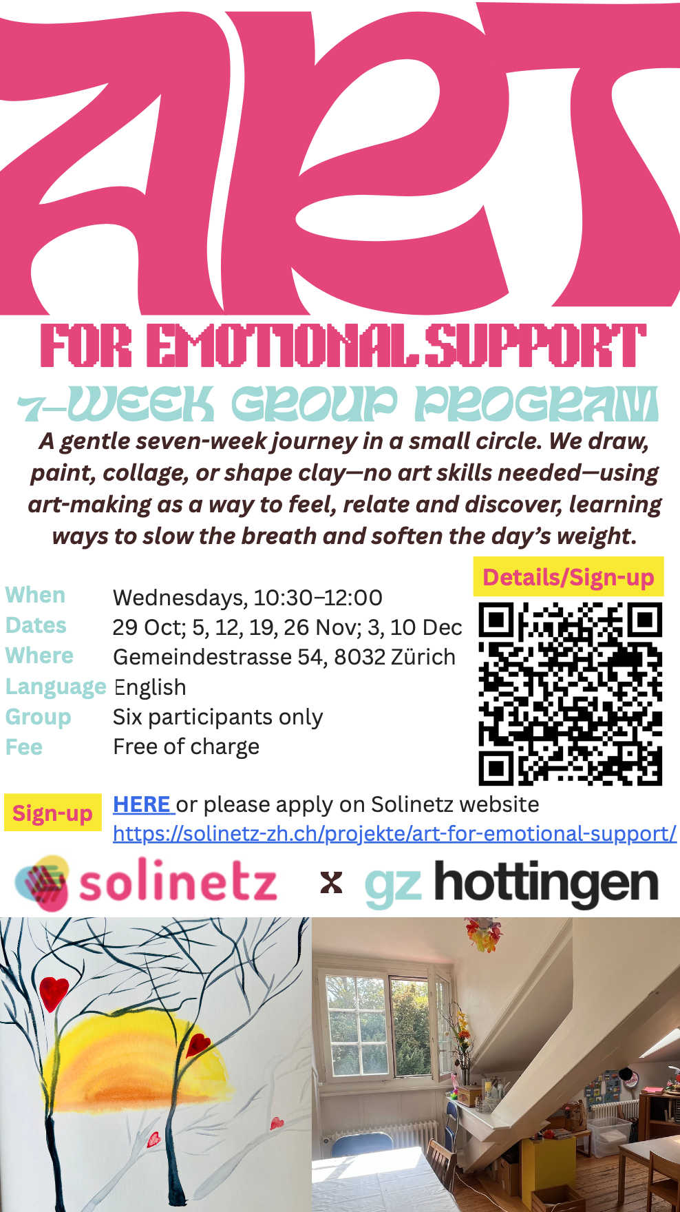 We draw, paint, collage, or shape clay — no art skills needed —